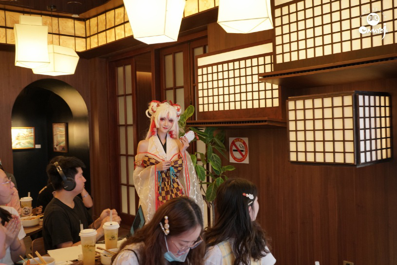 刚进入店内就有不知火店长前来迎接,轻旋舞步扬起柔顺裙摆,火蝶翩翩映亮银发流光。不知火店长在幽静庭院中悄然起舞,银发随身形飘动,步履优雅而蹁跹,不知火店长以扇掩唇,眼波盈盈尽是笑意。想想都觉得好美!!!