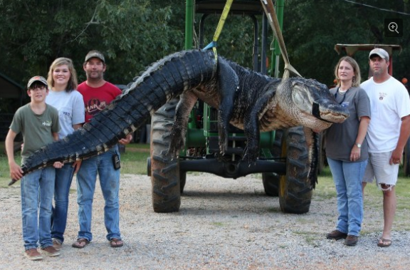 美国亚拉巴马州居民斯托克斯夫妇和他们的3名亲属上周末成功捕到一条大鳄鱼。这条鳄鱼体长约4.57米、重458.8公斤,是亚拉巴马州有记载以来最大的一条鳄鱼,并有望创下世界之最。